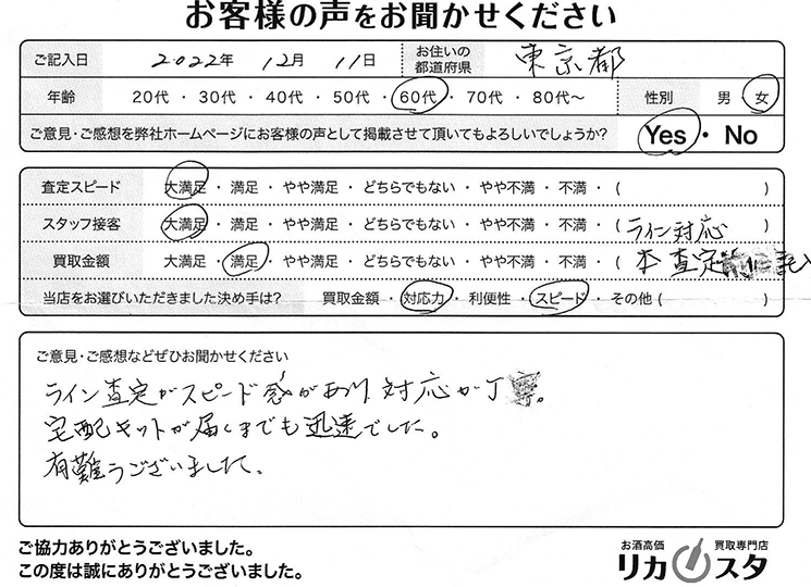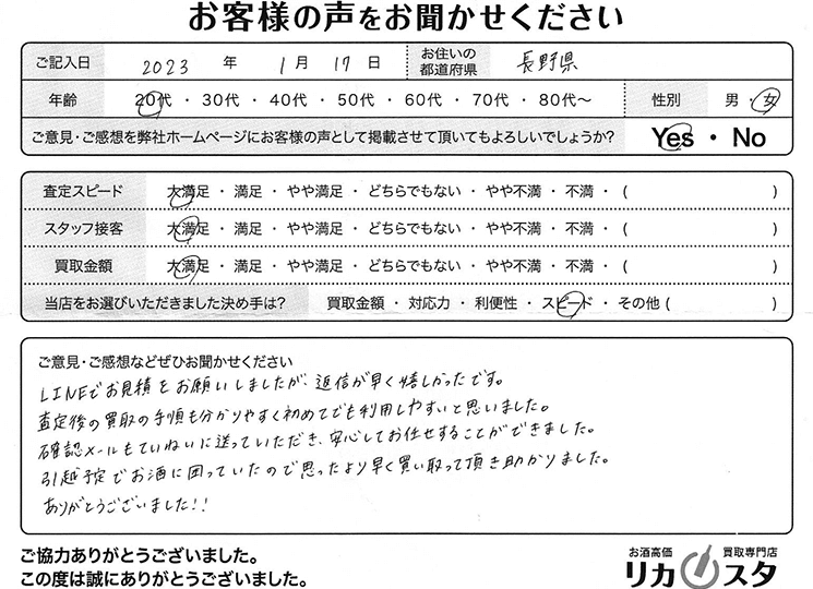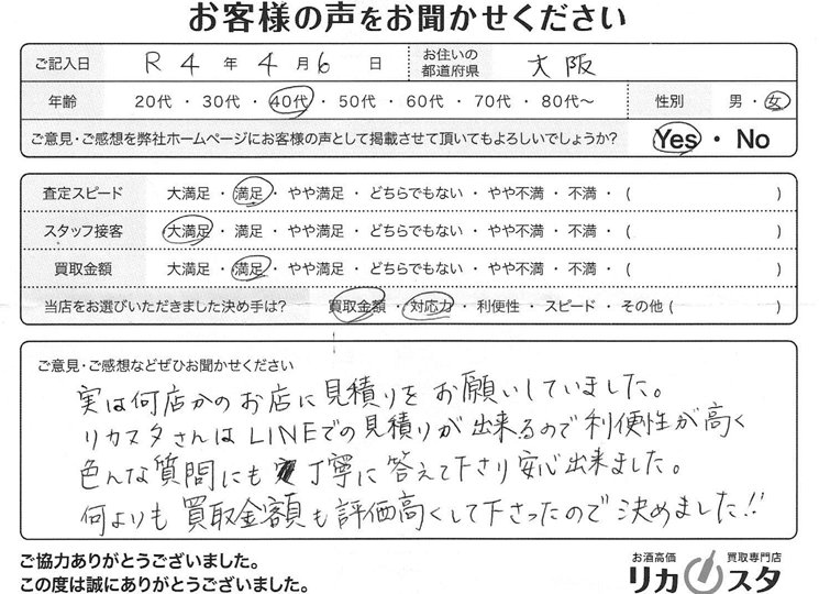 お客様コメント ライン査定がスピード感があり、対応が丁寧。 宅配キットが届くまでも迅速でした。有難うございました。 […]