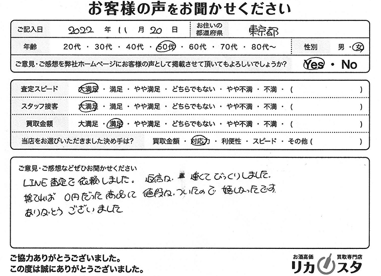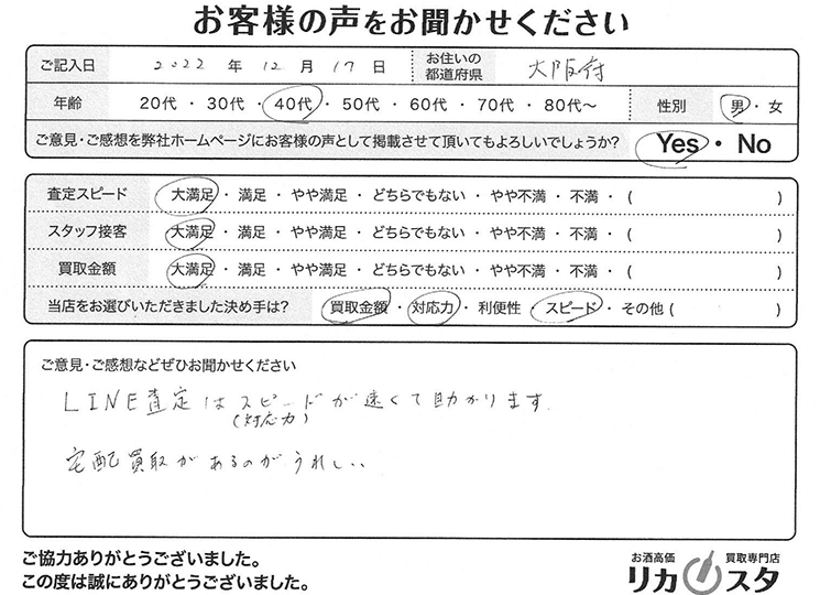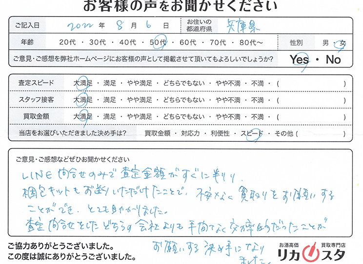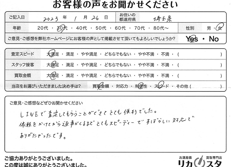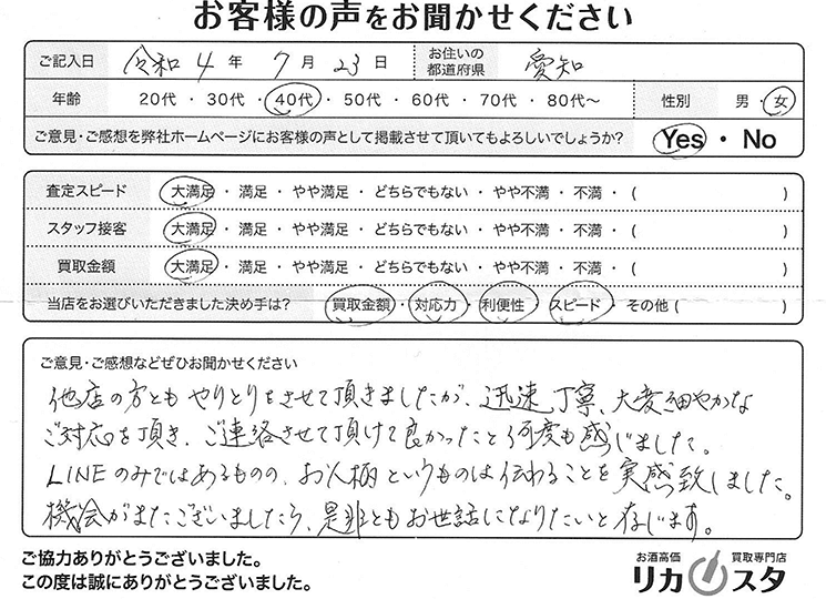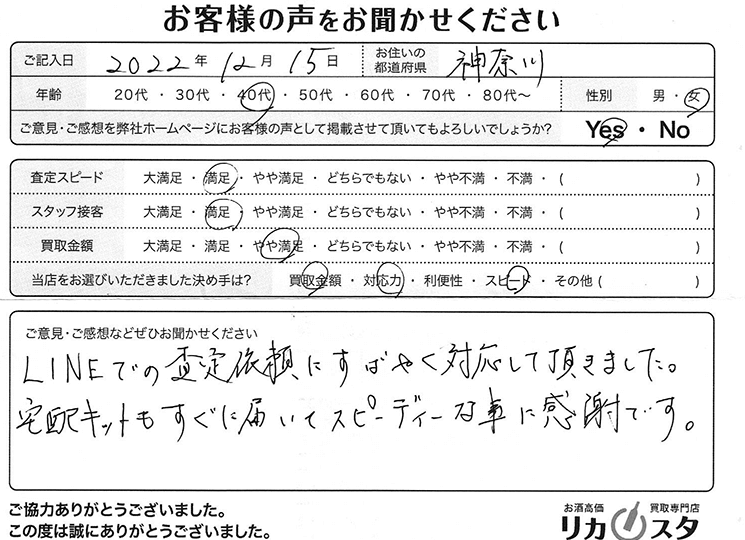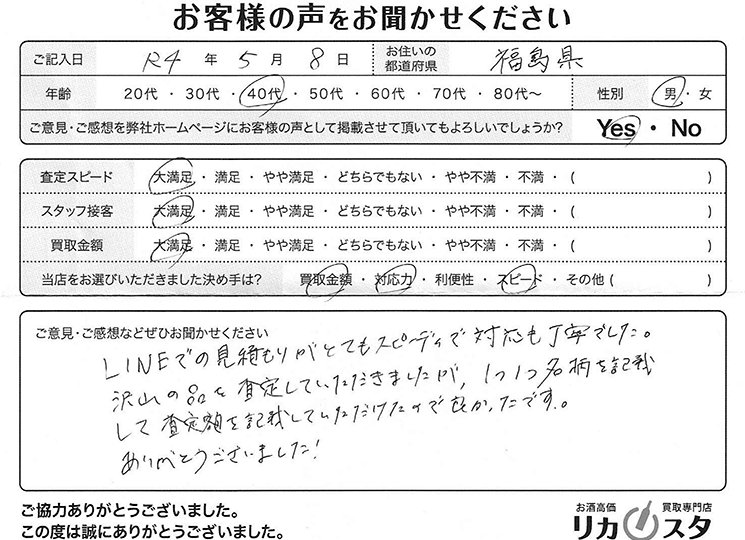 お客様コメント LINEでの見積もりがとてもスピーディで対応も丁寧でした。 たくさんの品を査定していただきましたが、一つ1つ銘柄を記載して、査定額を記載して […]