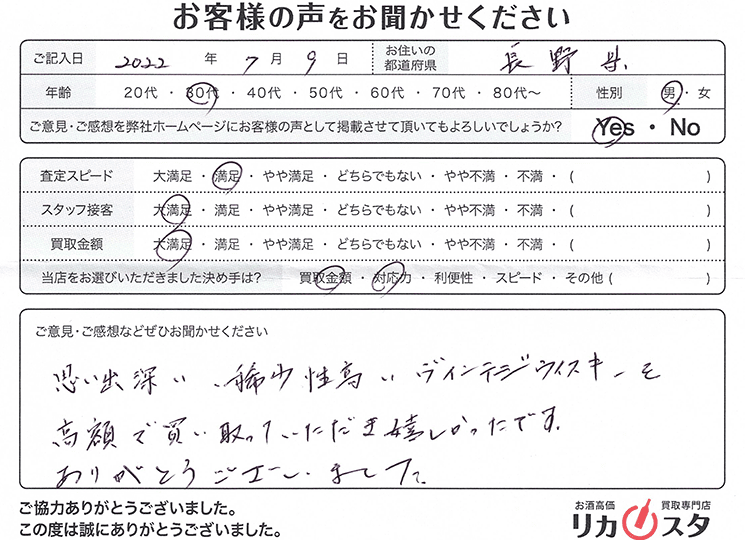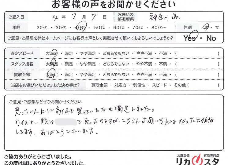 お客様コメント 長い間片付けたいと思っていたお酒を 買い取っていただけてスッキリできました。 ありがとうございます。 […]