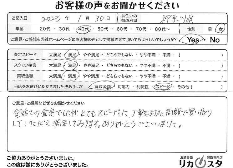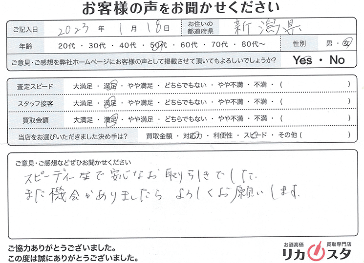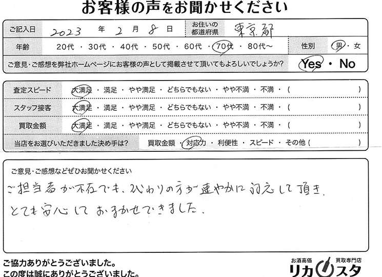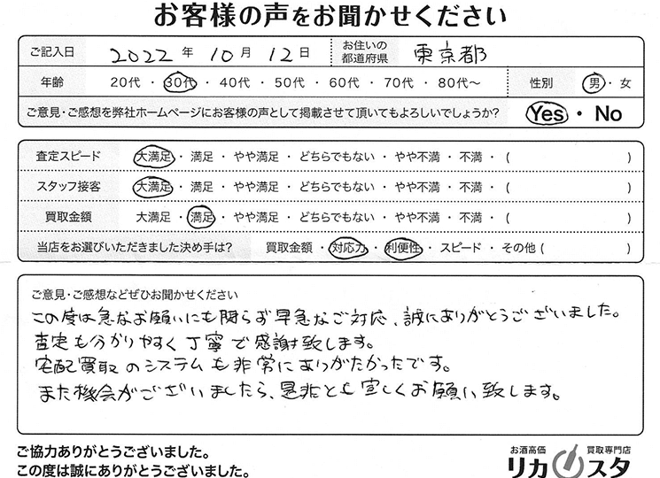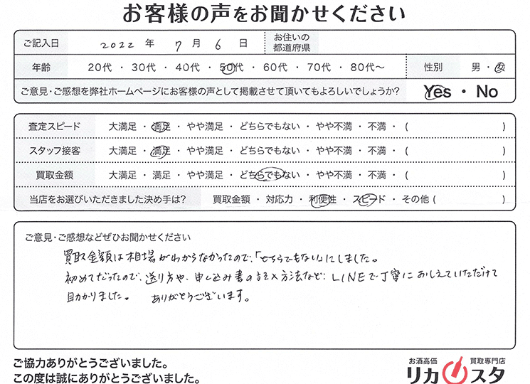 お客様コメント 初めてお酒の買取をしました。最初に電話をして対応も良く、査定も満足できる金額でした。 配送キットをお願いしたところ、全部用意をしていただけて […]