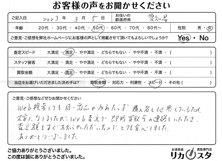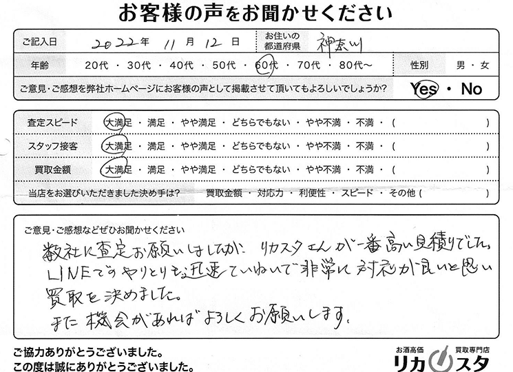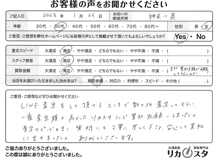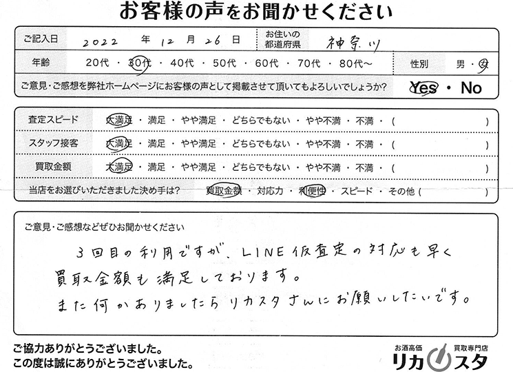 お客様コメント 3回目の利用ですが、LINE仮査定の対応も早く、買取金額も満足しております。 また何かありましたらリカスタさんにお願いしたいです。 […]