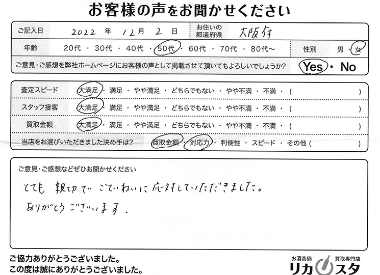 お客様コメント 買取金額への相談等にも快く応じて頂け、 大変良心的な買取店だと思いました。 スタッフ この […]