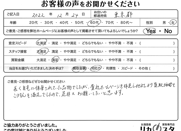 お客様コメント 長く自宅に保管されていた品物でしたが、 貴社ホームページを拝見し他社より買取価格もご対応も 満足でしたので、是非お願いしたいと思います。 ─ […]