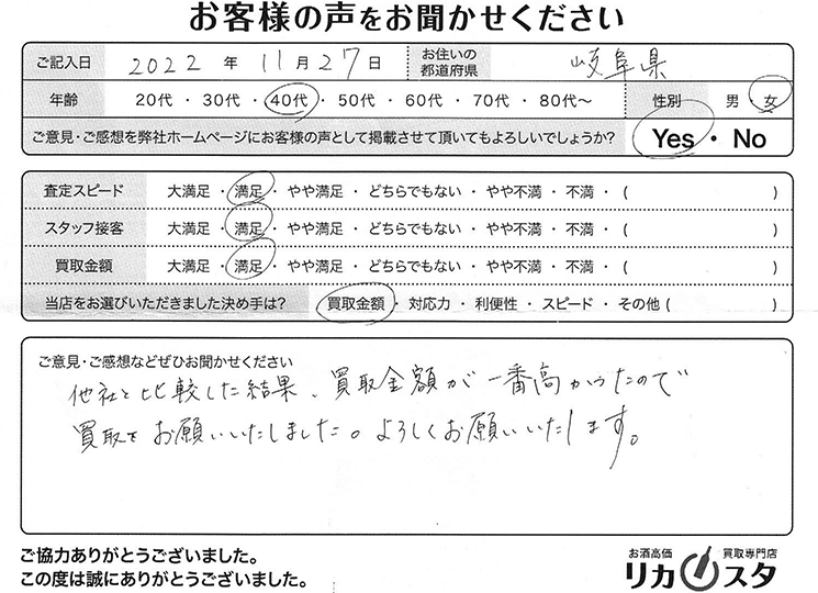 お客様コメント 他社より買取金額がよかったので満足してます。 ありがとうございました。 スタッ […]