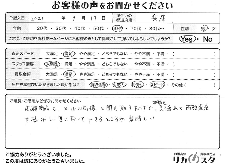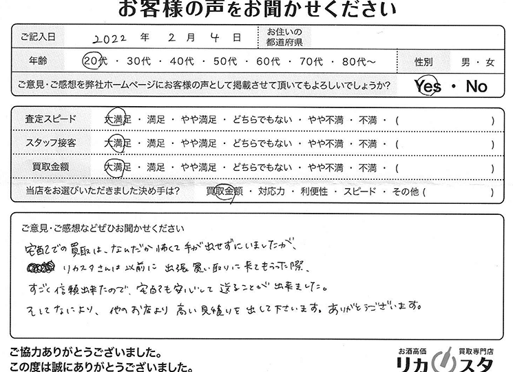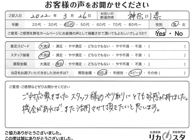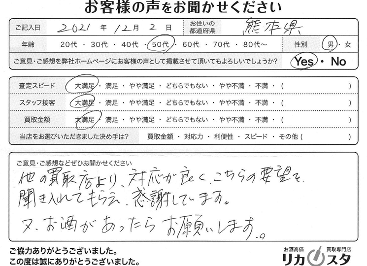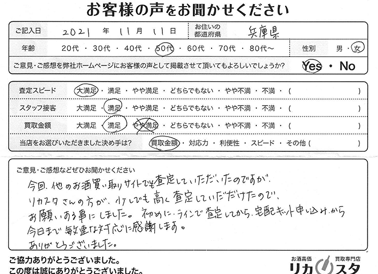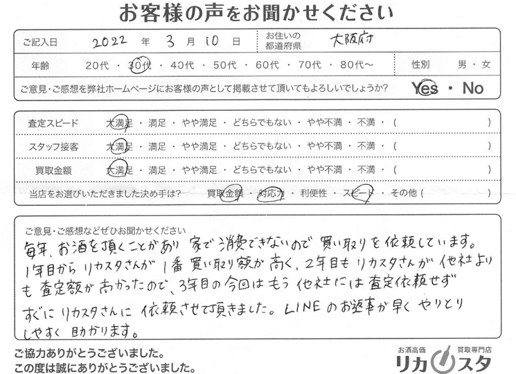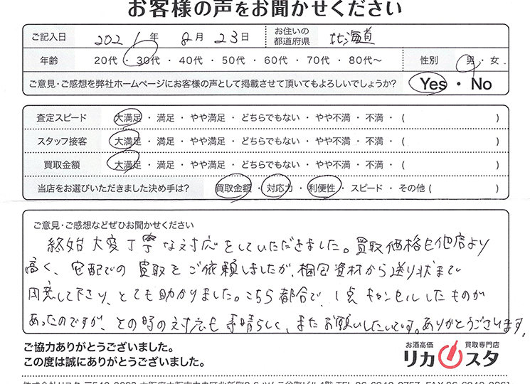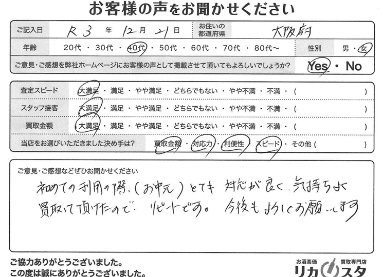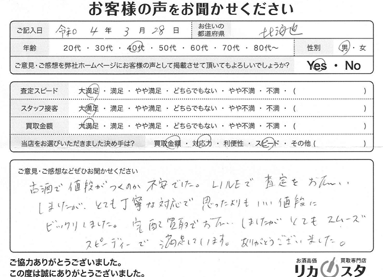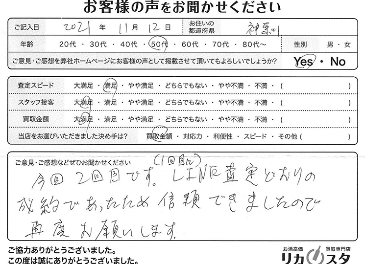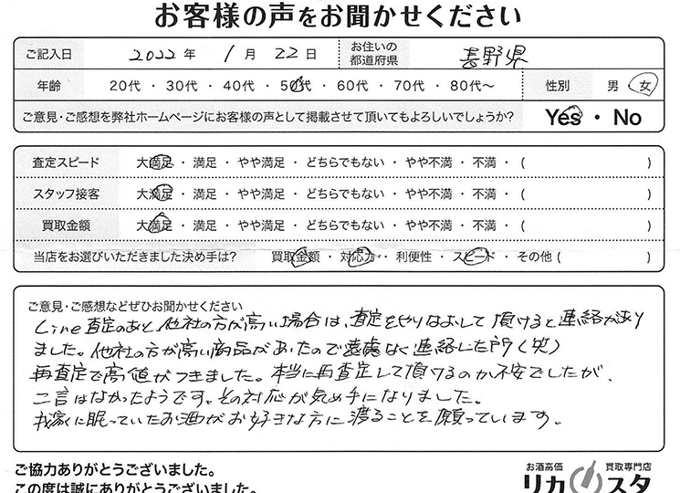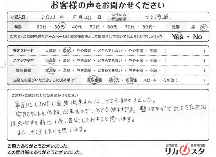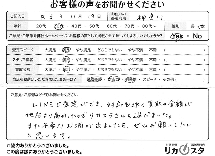 この度は、リカスタをご利用いただき誠にありがとうございます。 対応力やスピード力にご満足いただけ大変嬉しく思います! LINEは、気軽に連絡ができるのでとても便利ですよね。 またお酒をご売却する際は、当店をご利用いただけ […]