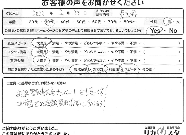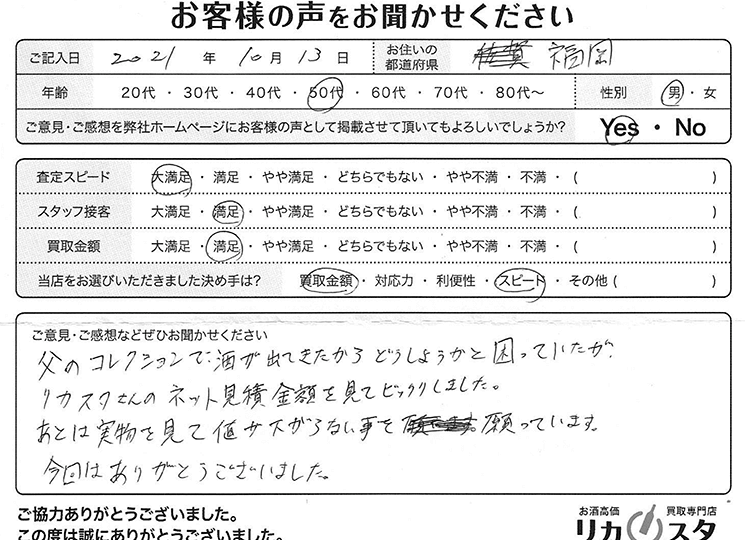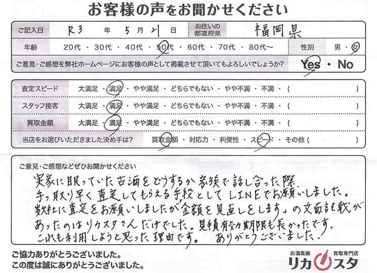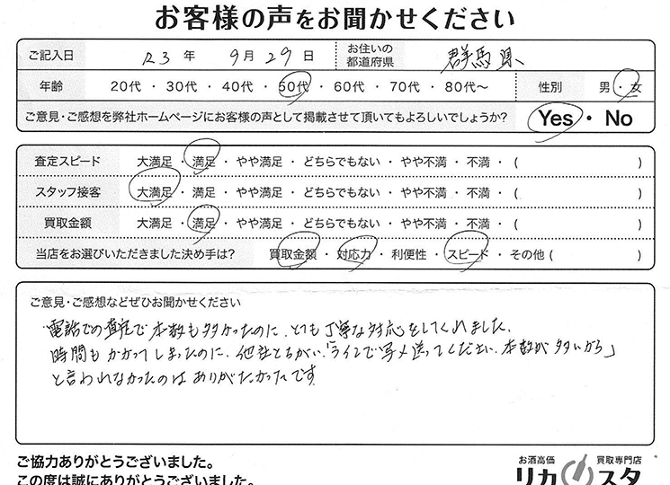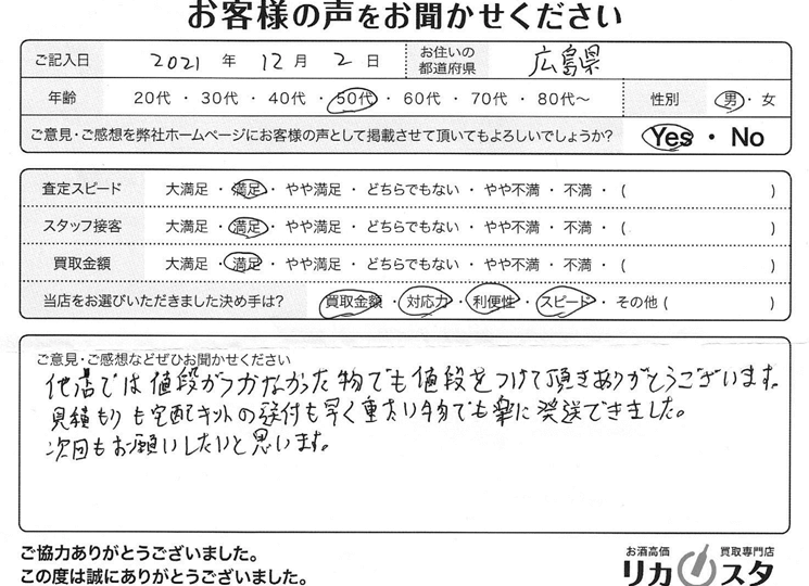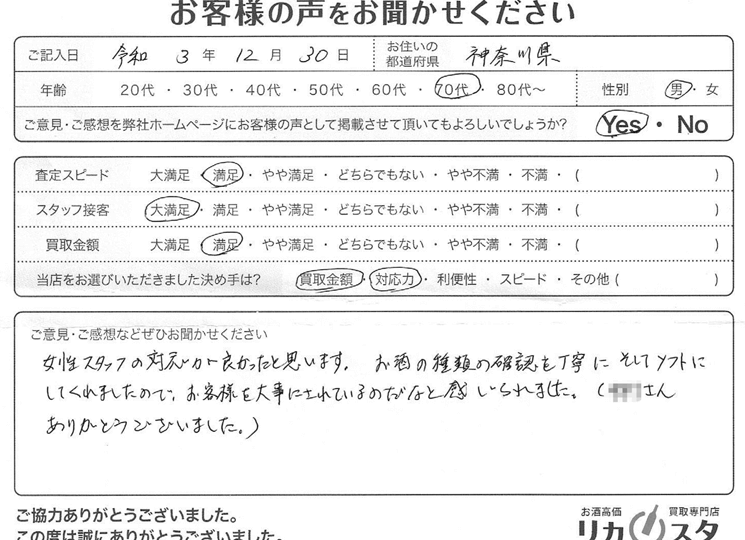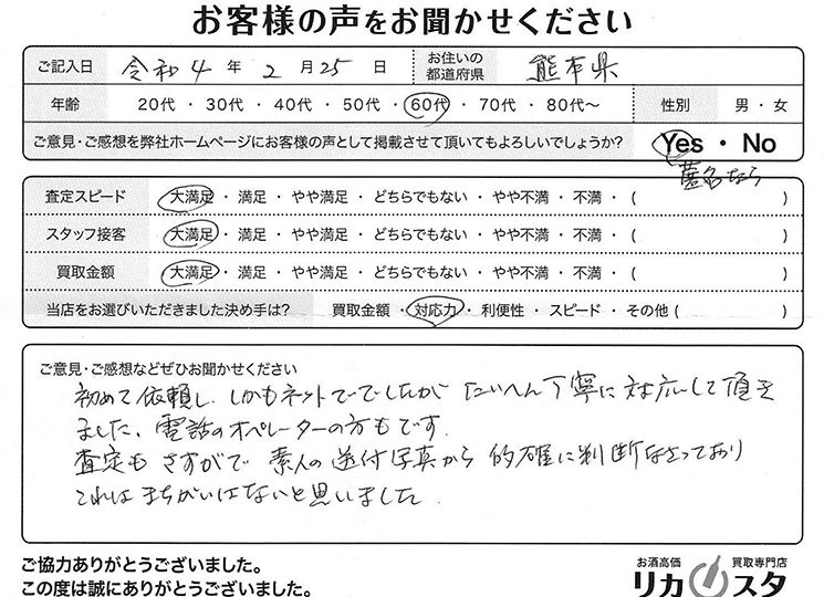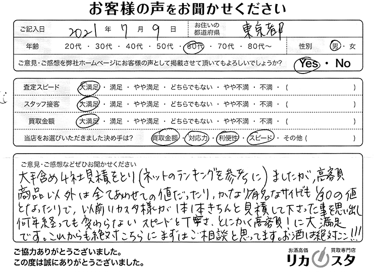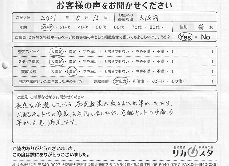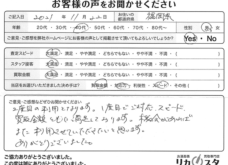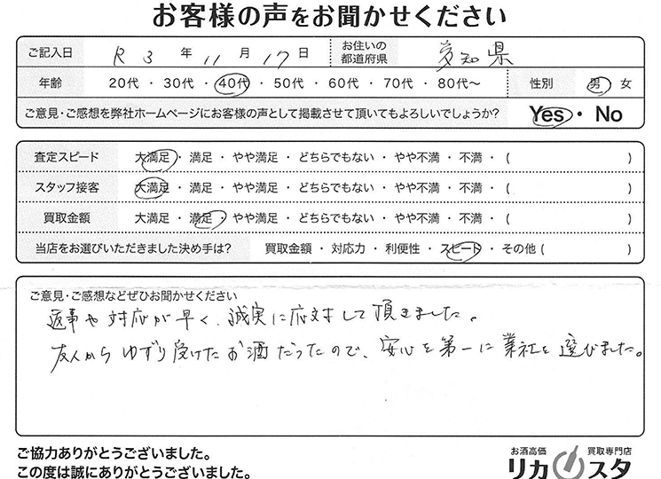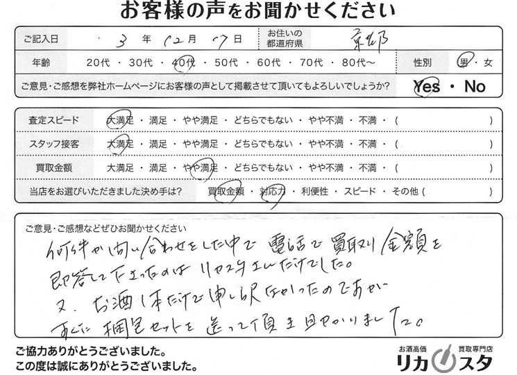 この度は、リカスタをご利用いただき誠にありがとうございます。 対応力やスピード力にご満足いただけ大変嬉しく思います! LINEは、気軽に連絡ができるのでとても便利ですよね。 またお酒をご売却する際は、当店をご利用いただけ […]