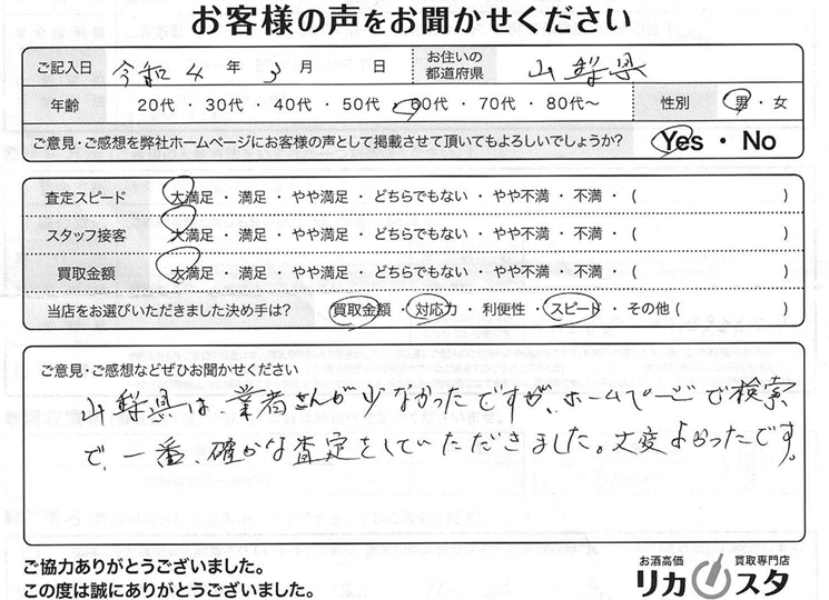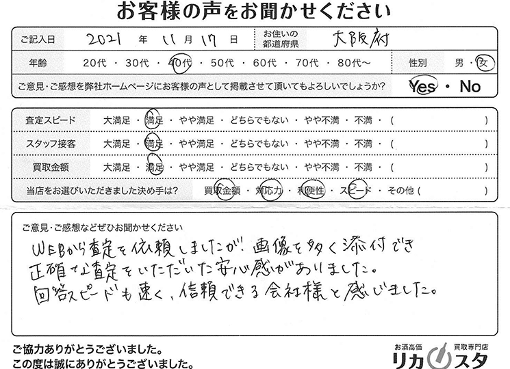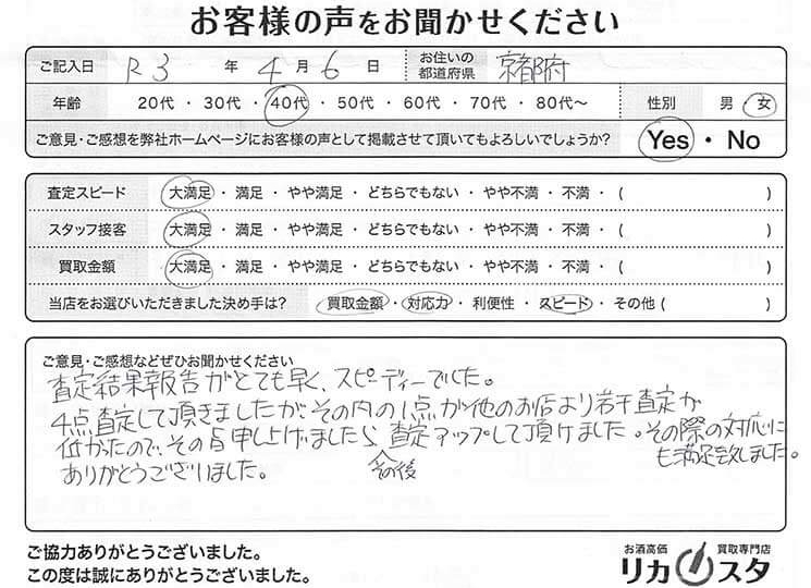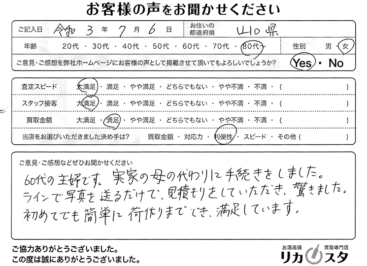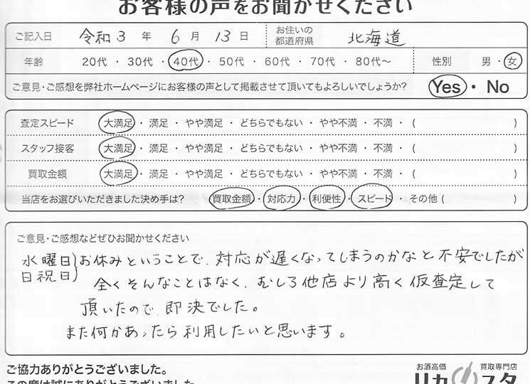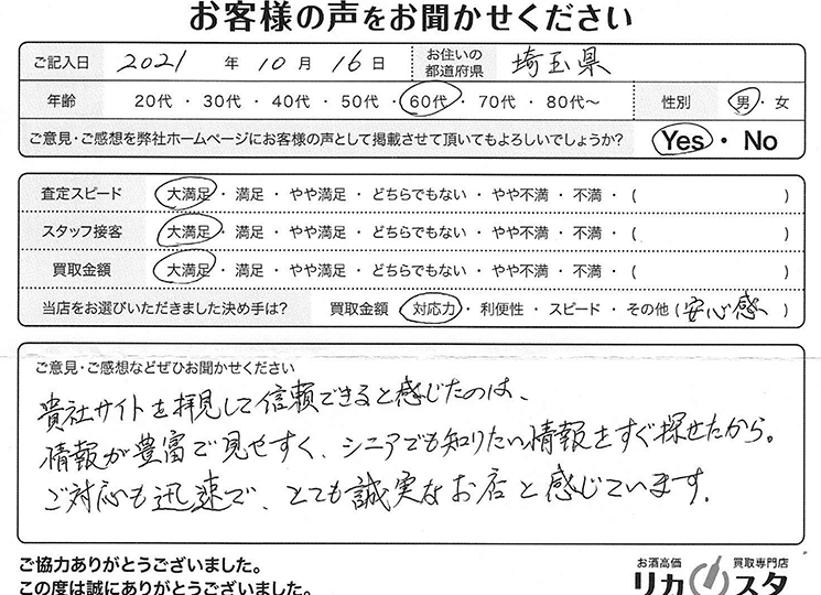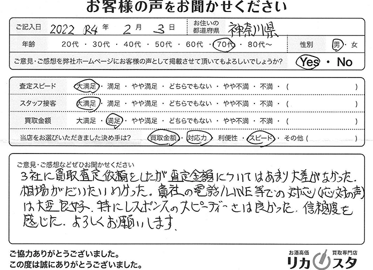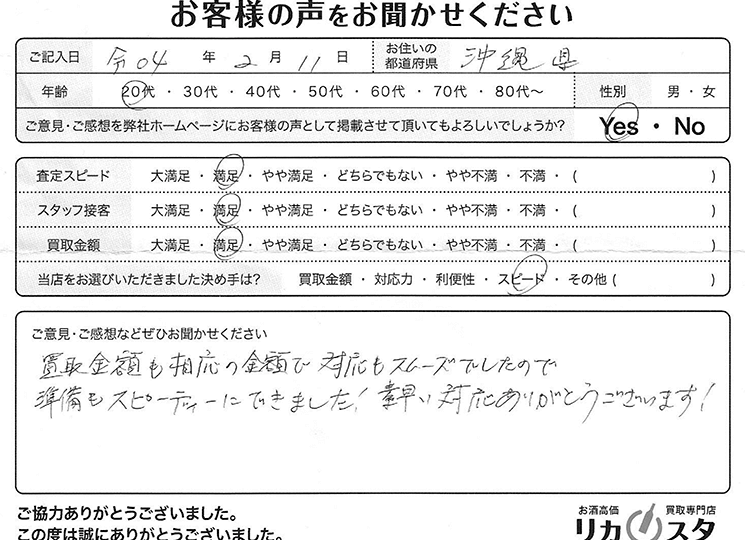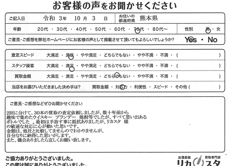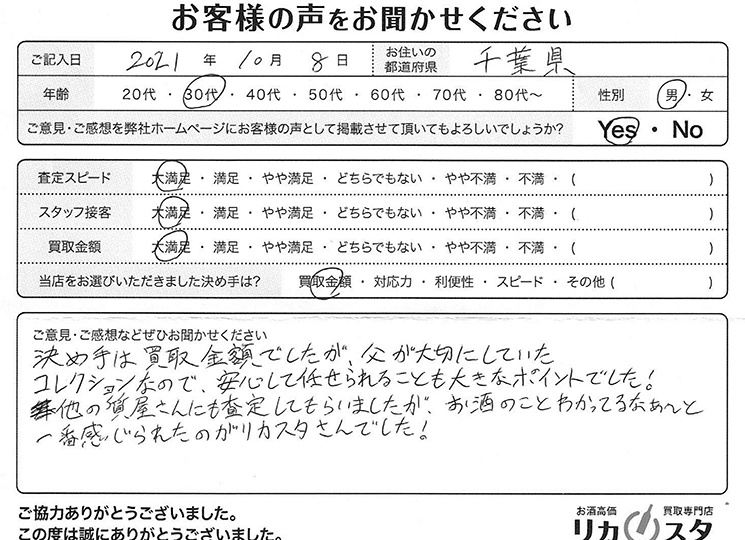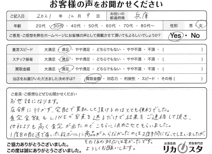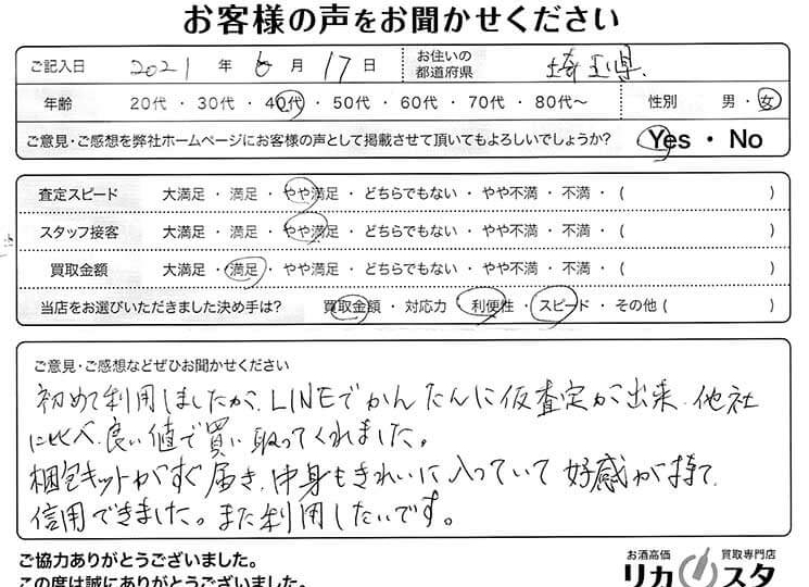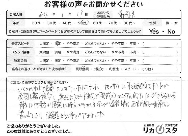 この度は、リカスタをご利用いただき誠にありがとうございます。 対応力やスピード力にご満足いただけ大変嬉しく思います! LINEは、気軽に連絡ができるのでとても便利ですよね。 またお酒をご売却する際は、当店をご利用いただけ […]