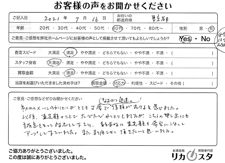 この度は、リカスタをご利用いただき誠にありがとうございます。 査定スピード・スタッフ接客・買取金額すべての項目につきまして、大満足との評価をいただき大変嬉しく思います! 初めての買取だったのですね。安心してお取引できたと […]