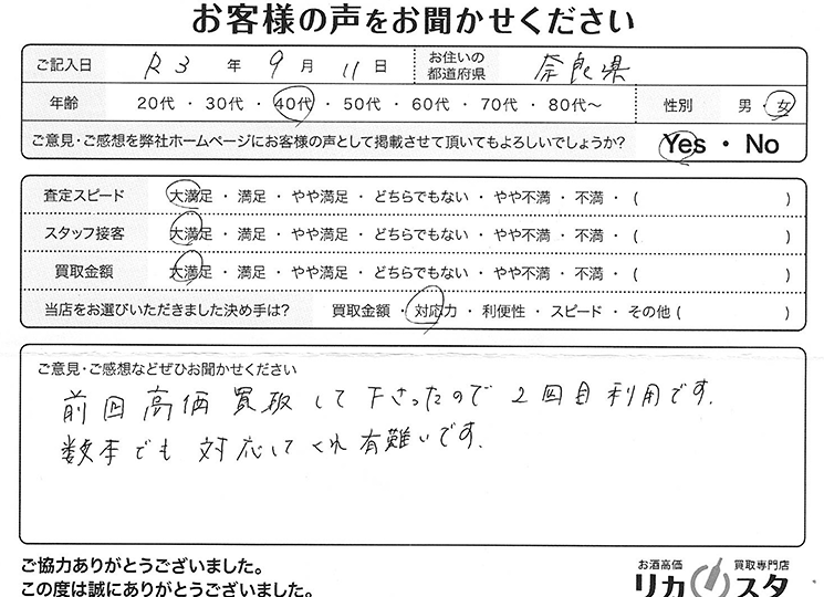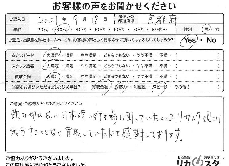 この度は当店リカスタをご利用いただき誠にありがとうございます。 お客様にご満足いただけ大変嬉しく思います! また「安心しておまかせできました」との言葉をお聞きでき、安堵いたしました。 余っているお酒がございましたら、お気 […]
