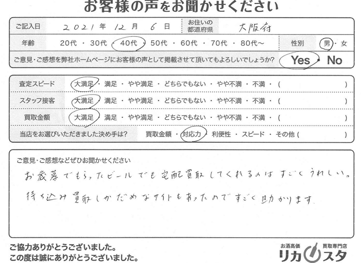 お客様コメント お歳暮でもらったビールでも宅配買取してくれるのはすごくうれしい。 持ち込み買取しかだめなサイトもあったので、すごく助かります。 […]