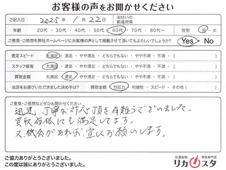 買取価格と対応力にお褒めの言葉を頂戴し、大変嬉しく思います!