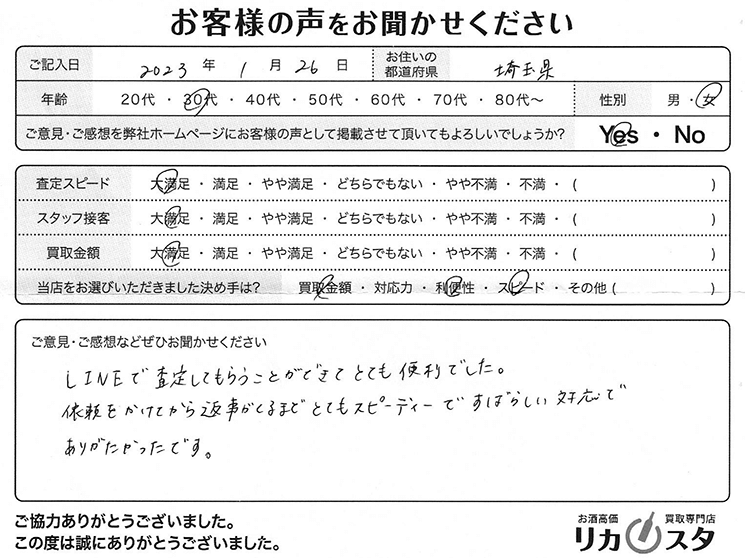 LINE査定での対応スピードなどにご満足いただけたご様子で、大変嬉しく思います。