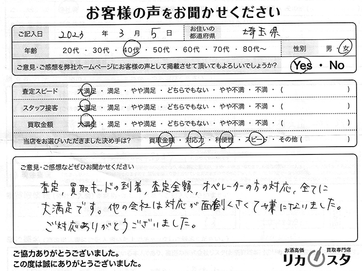査定、買取キットの到着、査定金額、オペレーターの方の対応、すべてに大満足です。