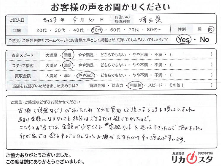 古酒(泡盛など)があったため、それを買取して頂けるところを捜していました。
