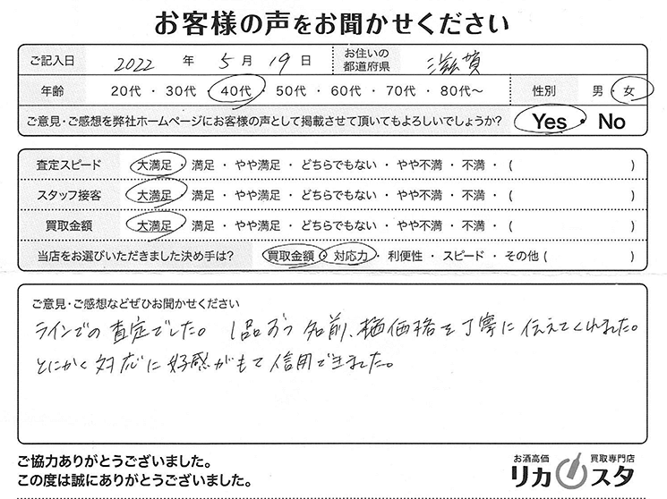 ラインでの査定でした。1品ずつ名前、買取価格を丁寧に伝えてくれました。