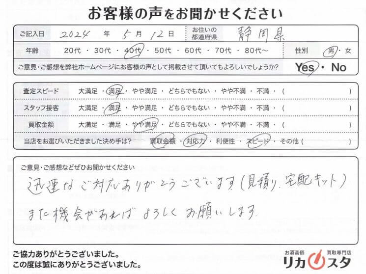 今回は、静岡県にお住いのお客様よりお買取りさせていただきました。