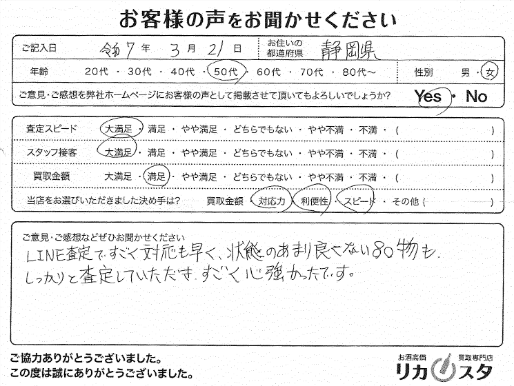 LINE査定ですごく対応も早く、状態のあまり良くない品物もしっかりと査定していただき、すごく心強かったです。