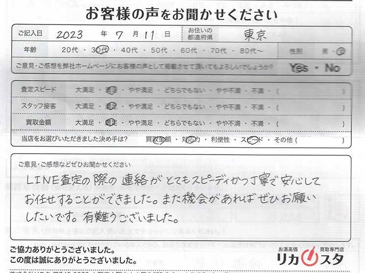 LINE査定の際の連絡がとてもスピーディかつ丁寧で安心してお任せすることができました。