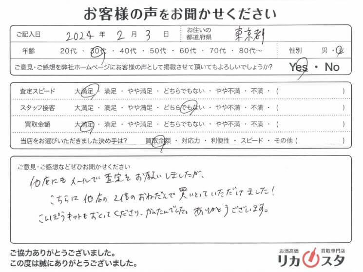 当店の査定額と宅配キットのサービスに、満足いただけたご様子で大変嬉しく思います!