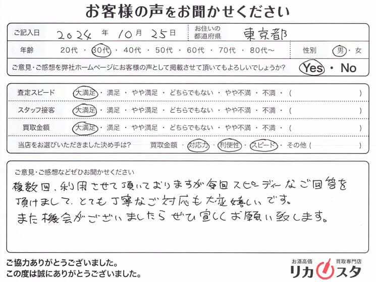 査定スピードとスタッフの対応にご満足いただけ大変嬉しく思います!