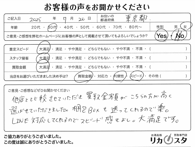 LINE査定と宅配キットの組み合わせで、手間なくご満足いただけたようで安心しております。