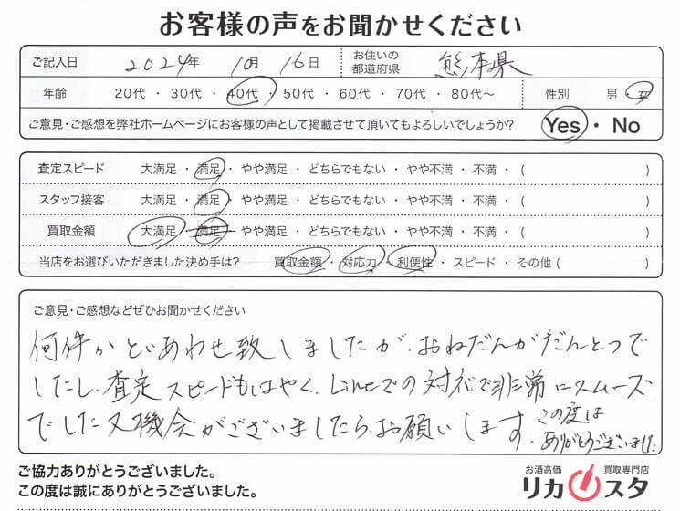買取価格及び対応スピードに関しましてお褒めの言葉を頂戴し大変嬉しい限りでございます。