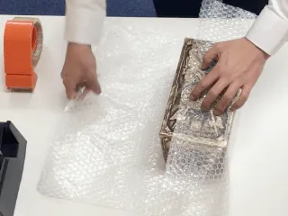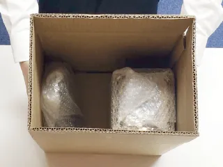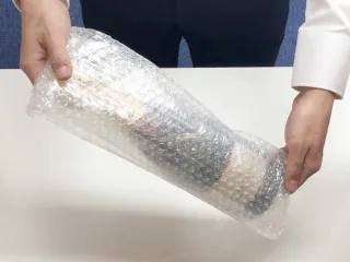 変形ボトルはシート状のプチプチの緩衝材で包む