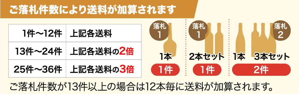 当店では“ご落札頂いた商品12件まで”同梱可能です。13件以上の場合は12本ごとに料金が加算されます。
