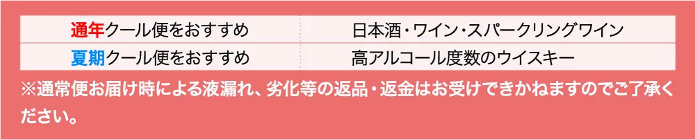 - ※日本酒・ワイン・スパークリング等冷蔵商品は冷蔵倉庫にありご注文後取寄しますので期日前のご来店ではお渡しできない場合がございます。