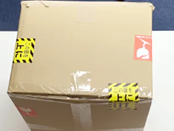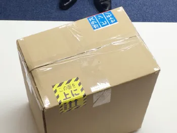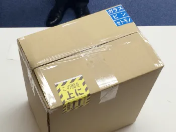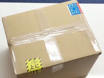 梱包後は、天面と側面に折りかけるように天地無用シール、側面など目立つ箇所にワレモノシールを貼ってください。