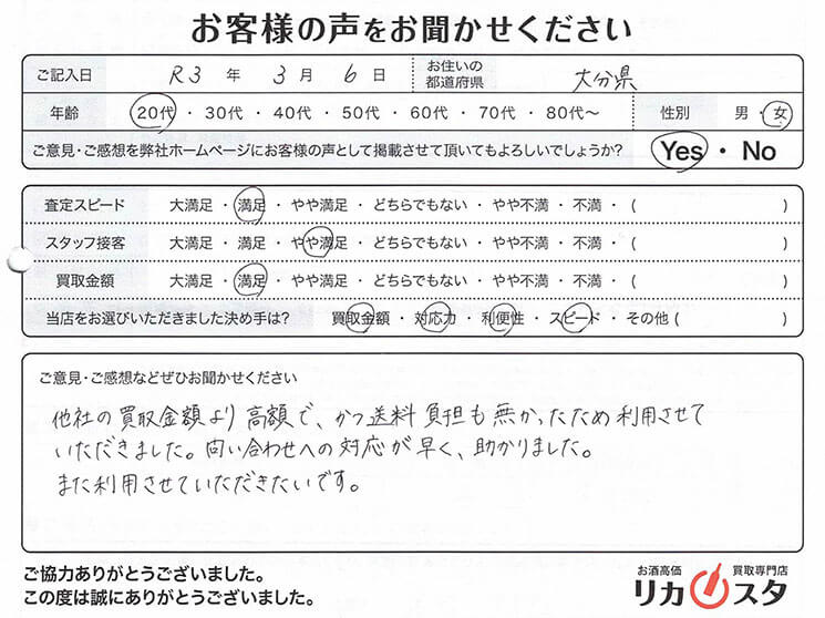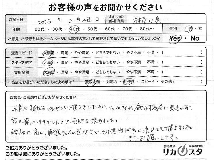 お客様コメント 以前に誕生日プレゼントで頂きましたが、なかなか飲む 機会に恵まれず、家に置いたままでしたので、売却を決めました。 他社より高く、配送キットの […]