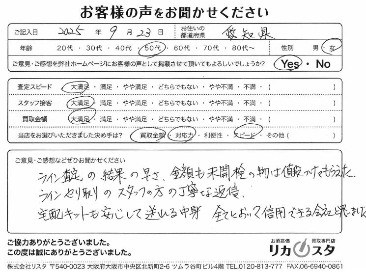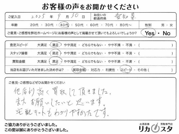 お客様コメント LINE査定の結果の早さ、金額も未開栓の物は値段つけてもらえた。LINEのやり取りのスタッフの方の丁寧な返信、宅配キットも安心して送れる中身 […]