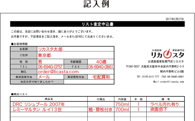 売りたいお酒のリストを作成します。下記情報をご記入いただきますとより正確なお見積もりが可能です。