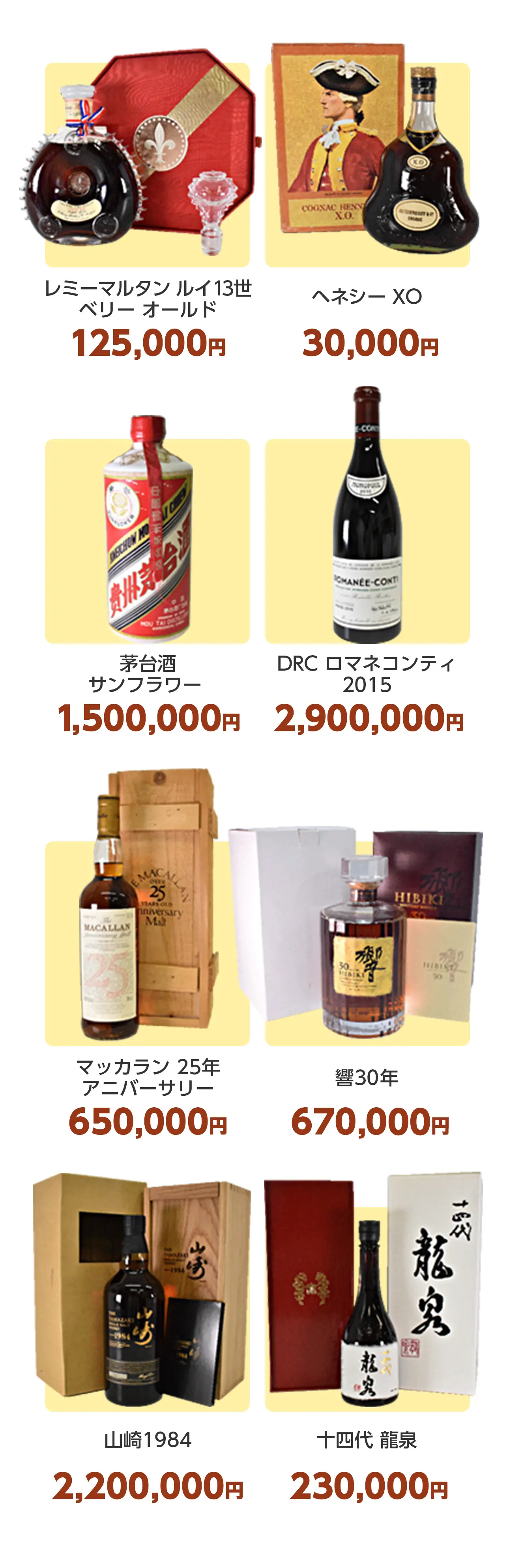 - ワイン・ウイスキー・ブランデー・焼酎・日本酒・ビールなど全ての酒類の買取