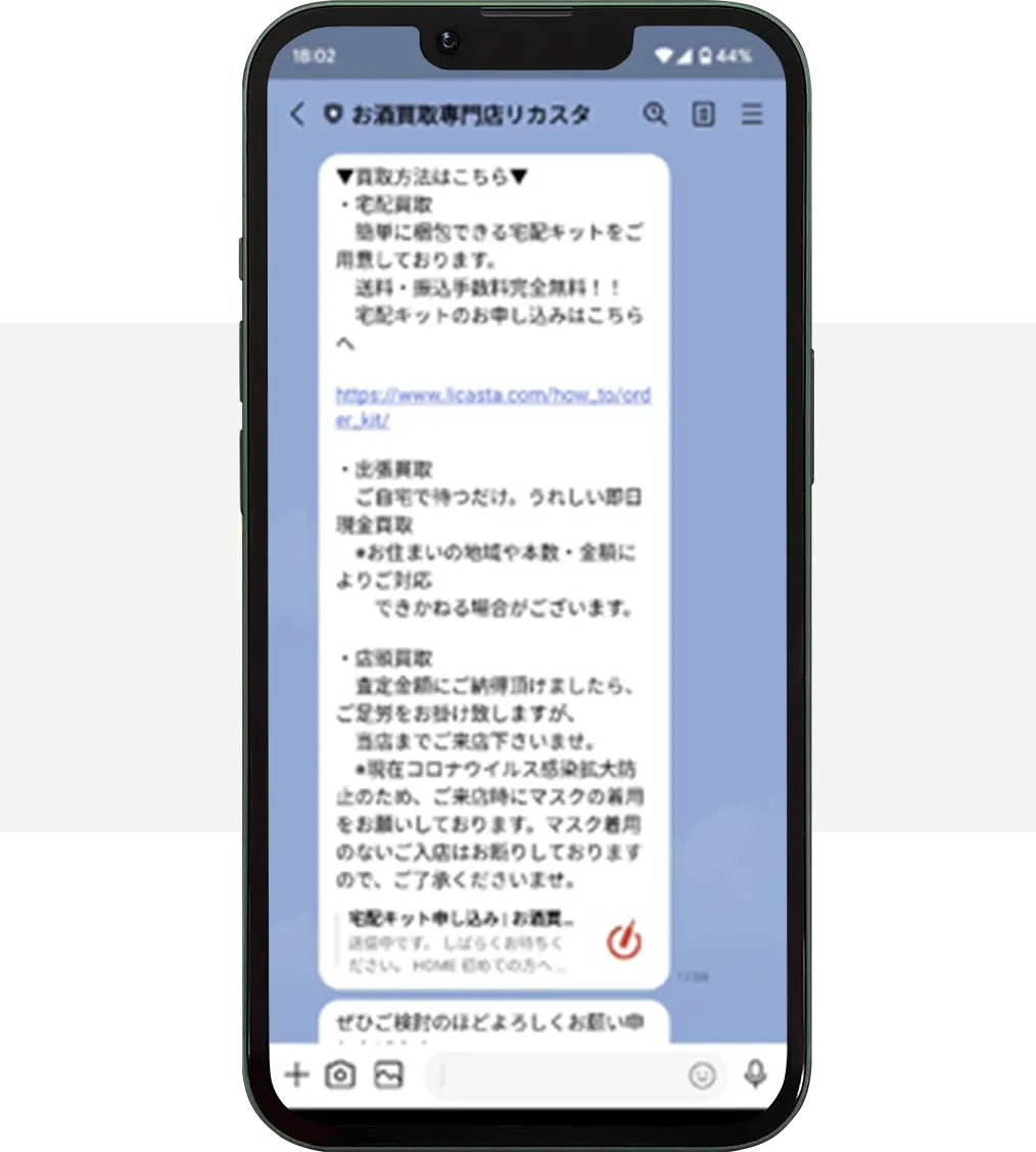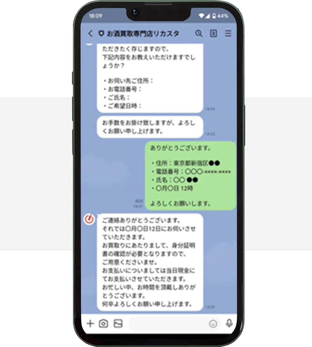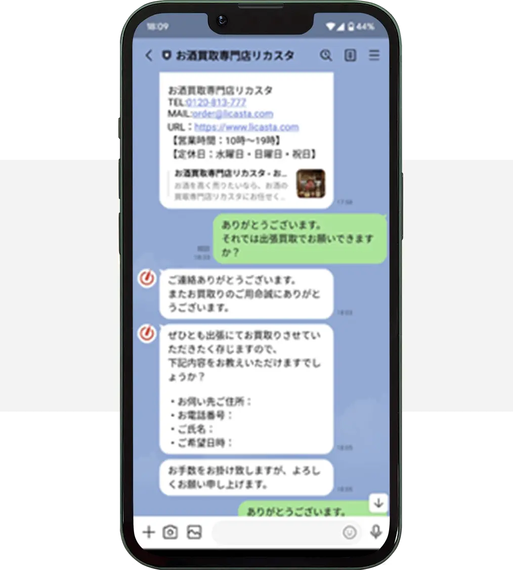 今回、リカスタさんに出張買取を依頼した決め手は、価格ではなく電話応対が丁寧で印象がよかったから。飲食店を営む中、定期的にお酒の在庫を整理するのですが、今回大量に処分しないといけなくなり困っていました。ほとんどがワインで、さらに本数も多いので買取してもらえるか不安でしたが、すぐに出張買取にきてくれ安心しました!また何かあれば相談しようと思います。