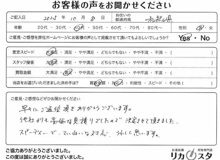 お客様コメント 山口県は田舎なので、酒の良さを分かってもらえる買取店がなく、困っていたところ、御社を知り査定をLINEでお願いしたところ(何回にも分けてお願 […]