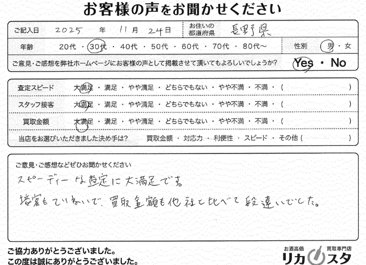 お客様コメント LINE査定の結果の早さ、金額も未開栓の物は値段つけてもらえた。LINEのやり取りのスタッフの方の丁寧な返信、宅配キットも安心して送れる中身 […]
