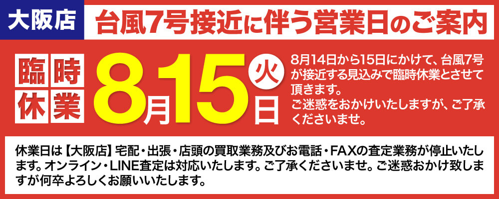 2023年8月15日(火)は、台風7号の影響に伴い【大阪店】を臨時休業とさせていただきます。なお、新宿店は通常営業となっております。