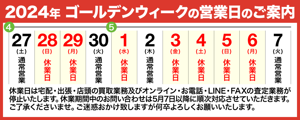 上記休業期間中は、宅配・出張・店頭の買取業務及びWEB・お電話・LINE・FAXなどの査定業務が停止いたします。