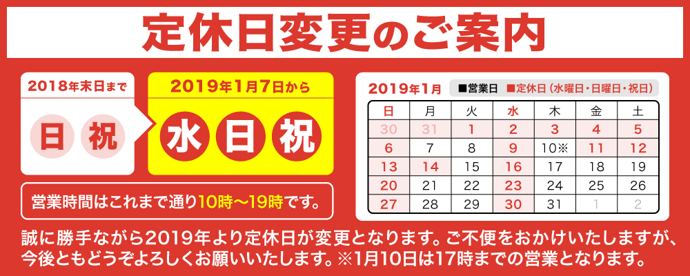 2019年1月より水曜日・日曜日・祝日を定休日とさせていただくこととなりました。